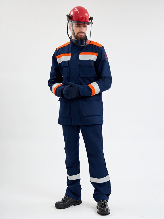 Костюм состоит из куртки и брюк летний легкий из огнезащитной ткани с уровнем защиты 56,8 кал/см кВ.