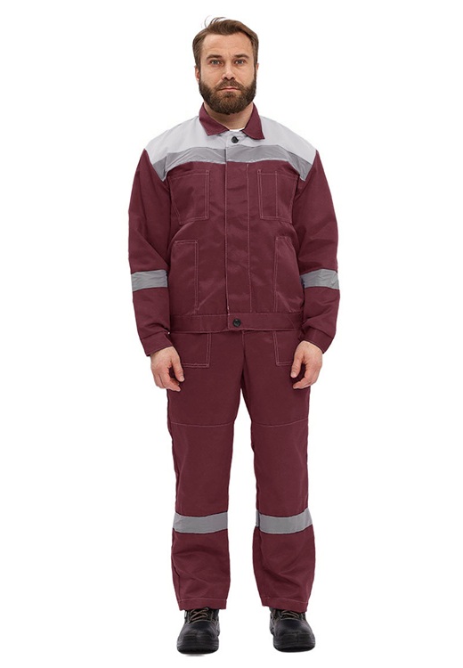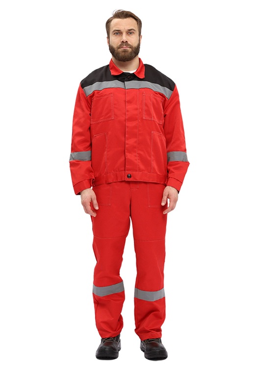 Брюки прямого силуэта с накладными карманами на передних половинках и с застежкой на гульфик с молнией. В области коленей усилительные накладки. По низу кокеток, на рукавах куртки и по низу брюк широкие световозвращающие полосы.