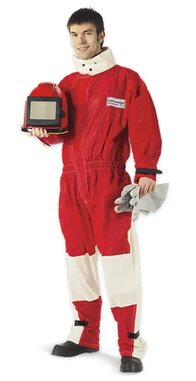 Стандартный костюм абразивоструйщика и кожаные перчатки защищают оператора от пыли и от рикошета абразива. Прочная хлопковая ткань на спине позволяет воздуху циркулировать, а вставки из толстой, специально обработанной кожи надёжно защищают оператора от пыли и рикошета абразива. Костюм оснащен двойной застёжкой "молния", застежками на брючинах для защиты от попадания пыли и абразива под одежду. Костюм прошит двойным швом для обеспечения долговечности эксплуатации.