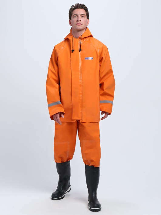 Влагозащитный костюм повышенной видимости имеет светооражающие полосы.