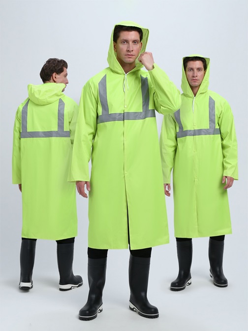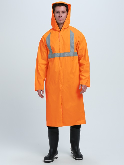 Влагозащитный плащ повышенной видимости имеет светооражающие полосы.