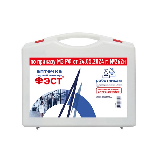 Аптечка "Фэст" медицинская изготовлена в соответствии с приказом Министерства здравоохранения РФ от 24.05.2024 г. № 262н., для оказания первой помощи работникам, пластиковый чемодан, размер 266х220х80